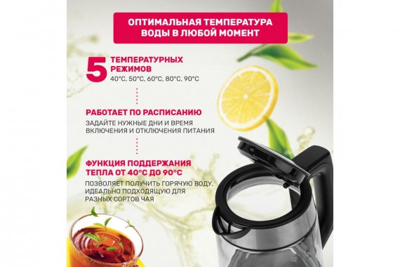 Через приложение пользователь может включать/выключать чайник, активировать режим подогрева воды до разных температур в течение суток в диапазоне от 40 до 90°C, устанавливать автоматическое включение в соответствии с выбранным временем и т.д.