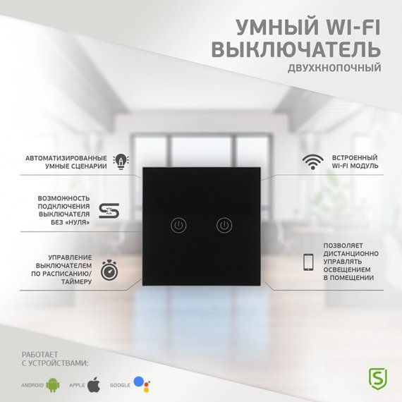 Умный Wi-Fi выключатель двухкнопочный черный SECURIC