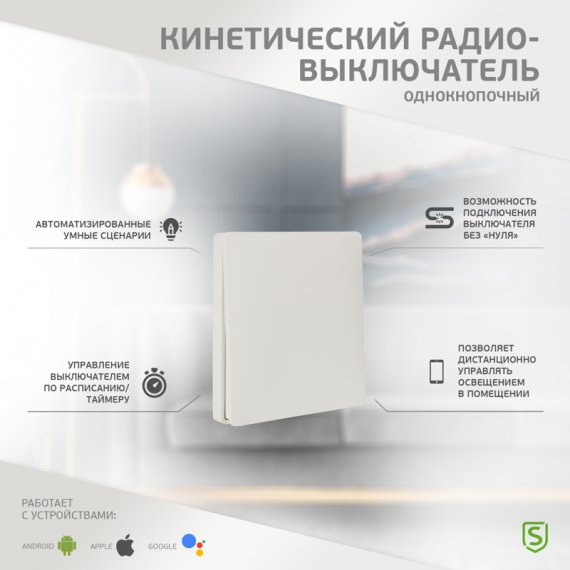 Одноклавишный кинетический радио-выключатель предназначен для включения/выключения различных световых приборов.