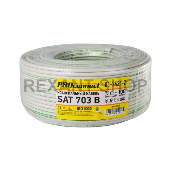 Характеристики кабеля SAT 703 B. Этот коаксиальный кабель состоит из центрального проводника и двойного экрана, размещенных соосно. Внутренний одножильный проводник изготовлен из омедненной стали и помещен в полиэтиленовый диэлектрик, способствующий сохранению соосного расположения проводников. Диаметр проводника 1,12 мм. Алюминиевый экран, наложенный на сердечник, имеет дополнительную плотную алюминиевую оплетку и благодаря этому надежно защищает передаваемый сигнал от внешних помех. Номинальное волновое сопротивление кабеля SAT 703B CABLETECH– 75 Ом. Внешняя оболочка изготовлена из ПВХ и имеет белый цвет.