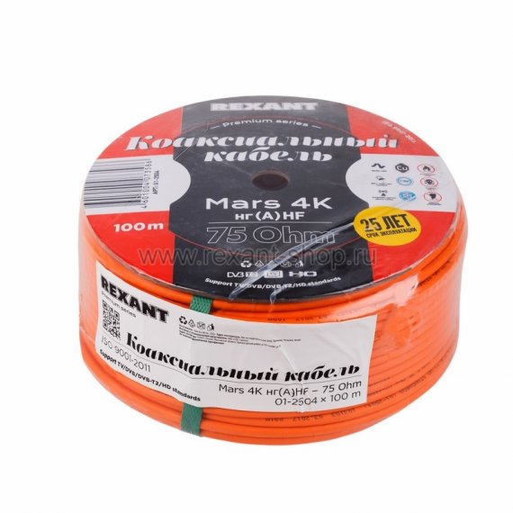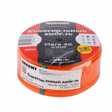 Кабель MARS 4K 75 Ohm REXANT. Состоит из центрального медного провода и металлической оплетки (экрана), разделенных между собой слоем диэлектрика (внутренней изоляции) и имеет общую внешнюю оболочку из безгалогенного композита нг(А)-HF. Кабель служит для передачи высокочастотных сигналов и имеет волновое сопротивление 75 Ом. Коаксиальные кабели, предназначенные для работы в СВЧ диапазоне, называются еще радиочастотными кабелями.