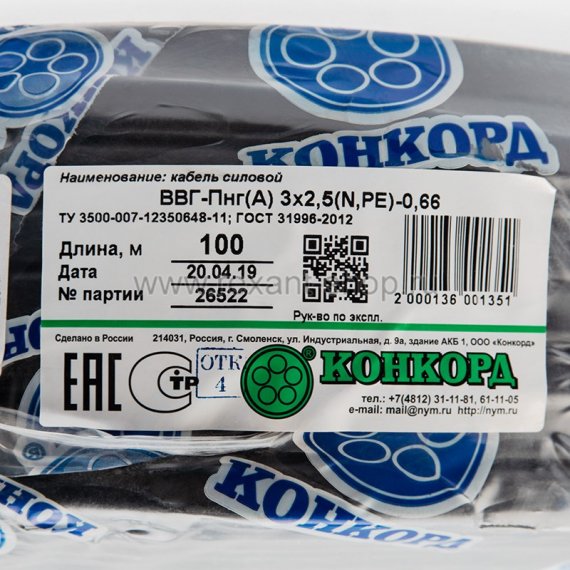 Кабель силовой медный ВВГ-Пнг(А)-LS 3x2,5 мм?, 100 м ГОСТ Конкорд