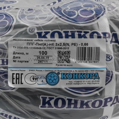 Кабель силовой медный ППГ-Пнг(А)-HF - 0,66 3х2,5 мм?, 100 м ГОСТ Конкорд