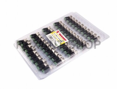 РАЗЪЁМ штекер BNC с клеммной колодкой REXANT предназначен для подключения коаксиального кабеля c волновым сопротивлением 50 или 75 Ом, к видеокамерам, видеорегистраторам, мониторам и другим радиоэлектронным устройствам. BNC-коннектор (BNC сокр. от Bayonet Neill Concelman) с клеммной колодкой - электрический разъем с байонетной фиксацией закрепляется на кабеле зажимом с помощью винтов. Этот способ крепления значительно проще и быстрее, чем пайка и обжим, но его надежность и качество соединения остаются на неизменно высоком уровне. BNC-разъем изготовлен из материалов: