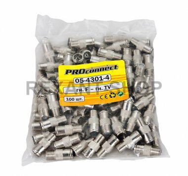 ПЕРЕХОД гнездо F - гнездо TV с кольцом (03-084-B) PROCONNECT предназначен для соединения двух кабелей волновым сопротивлением 50 или 75 Ом, имеющих на концах разные типы ТВ-разъемов. Применяется главным образом для подключения эфирного, кабельного и спутникового телевидения к телевизионному оборудованию. Отличительной особенностью переходника является наличие амортизирующего кольца для ТВ-гнезда, обеспечивающее наилучший контакт с разъемом. С одной стороны находится гнездо F-разъема, а с другой гнездо ТВ-разъема. Изготовлен переход из никелированного сплава первичной меди (биметалл), что гарантирует минимальный уровень потерь при прохождении сигнала. Разъем соединяет кабель методом накрутки F-коннектора с одной стороны, после соответствующей зачистки контактов, и стыковки штекера ТВ с другой, не требуя в ходе монтажа применения каких-либо специальных инструментов. Такой высокочастотный соединитель имеет ряд положительных преимуществ: