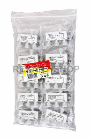 Телевизионный делитель это удобное средство для разделения сигнала на несколько равных частей. Антенные делители, также называемые телевизионные сплиттеры ,часто используются когда требуется подключить один телевизионный кабель, идущий от антенны, сразу к нескольким телевизорам. Особенно это актуально в многокомнатных квартирах или многокомнатных загородных домах. Делитель имеет один вход под F разъем и три выхода, также под F разъемы. Сигнал, подающийся на вход делителя, делится на три равные части и передается на выходы. Для подключения кабелей используются стандартные F-разъемы. Полоса пропускания делителя от 5 до 1000МГц, эти частоты используются для стандартного эфирного телевидения. Качественно изготовленный ТВ сплиттер Rexant долго и надежно прослужит в составе телевизионной системы, делая удобной эксплуатацию нескольких телевизоров.