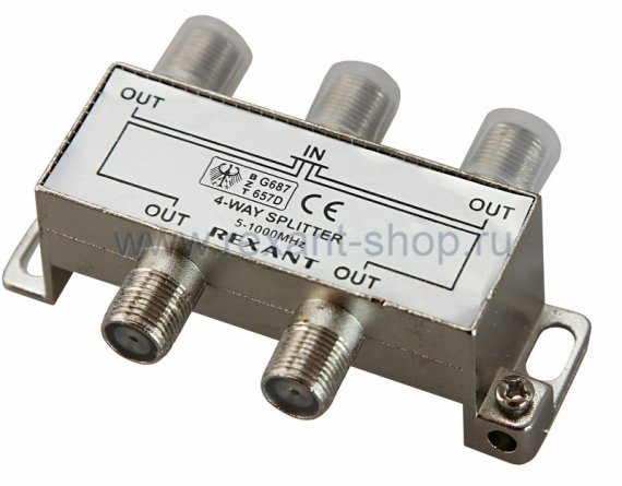Телевизионный делитель это удобное средство для разделения сигнала на несколько равных частей. Антенные делители, также называемые телевизионные сплиттеры ,часто используются когда требуется подключить один телевизионный кабель, идущий от антенны, сразу к нескольким телевизорам. Особенно это актуально в многокомнатных квартирах или многокомнатных загородных домах. Делитель имеет один вход под F разъем и четыре выхода, также под F разъемы. Сигнал, подающийся на вход делителя, делится на четыре равные части и передается на выходы. Для подключения кабелей используются стандартные F-разъемы. Полоса пропускания делителя от 5 до 1000МГц, эти частоты используются для стандартного эфирного телевидения. Качественно изготовленный ТВ сплиттер Rexant долго и надежно прослужит в составе телевизионной системы, делая удобной эксплуатацию нескольких телевизоров.