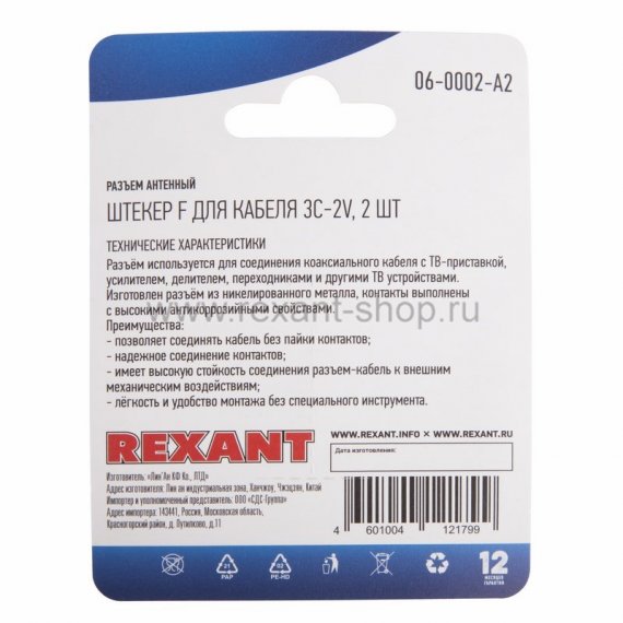 Rexant Разъем антенный на кабель, штекер F для кабеля 3C-2V 06-0002-A2