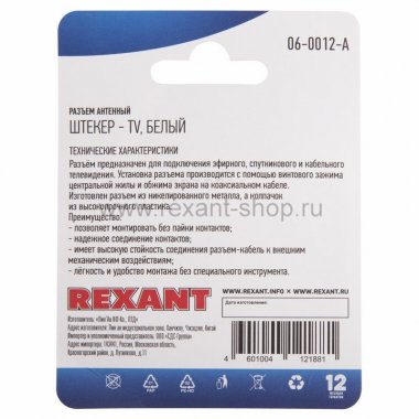 Разъём предназначен для подключения эфирного, спутникового и кабельного телевидения. Установка разъема производится с помощью винтового зажима центральной жилы и обжима экрана на коаксиальном кабеле. Изготовлен разъем из никелированного металла, а колпачок из высокопрочного пластика.