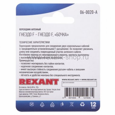 Rexant Переходник антенный, (гнездо F - гнездо F) 06-0020-A