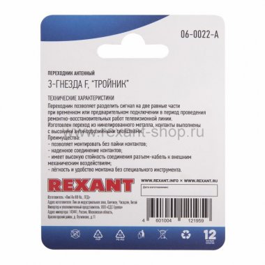 Rexant Переходник антенный, (3-гнезда F) 06-0022-A Rexant 06-0022-A