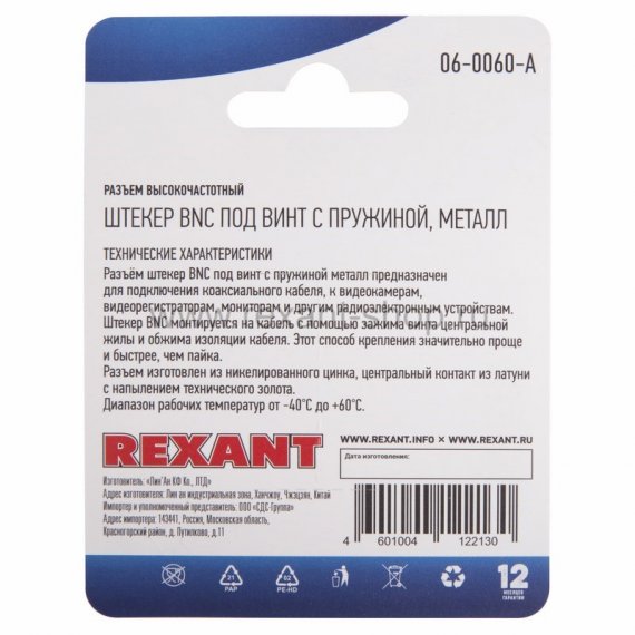 Rexant Разъем высокочастотный на кабель, штекер BNC под винт с пружиной 06-0060-A