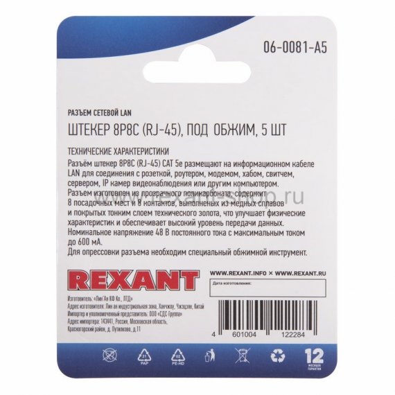 Разъем сетевой LAN на кабель, штекер 8Р8С (Rj-45), под обжим (5шт.) REXANT