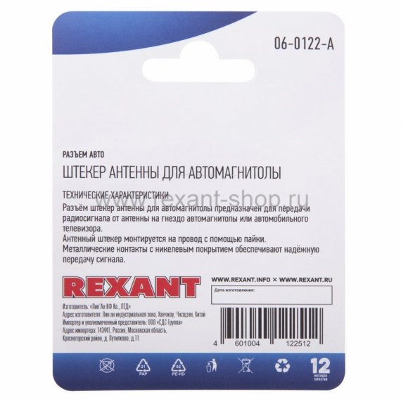 Купить по низким ценам Rexant 06-0122-A Описание Rexant 06-0122-A Разъём штекер антенны для автомагнитолы предназначен для передачи радиосигнала от антенны на гнездо автомагнитолы или автомобильного телевизора.