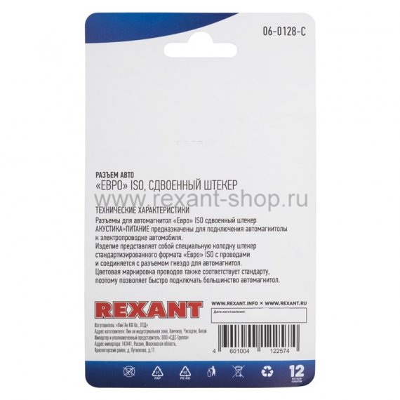 Купить по низким ценам Rexant 06-0128-C Описание Rexant 06-0128-C Разъемы для автомагнитол "Евро" ISO сдвоенный штекер АКУСТИКА+ПИТАНИЕ предназначены для подключения автомагнитолы к электропроводке автомобиля. Изделие представляет собой специальную колодку штекер стандартизированного формата "Евро" ISO с проводами и соединяется с разъемом гнездо для автомагнитол. Цветовая маркировка проводов также соответствует стандарту, поэтому позволяет быстро подключать большинство автомагнитол.