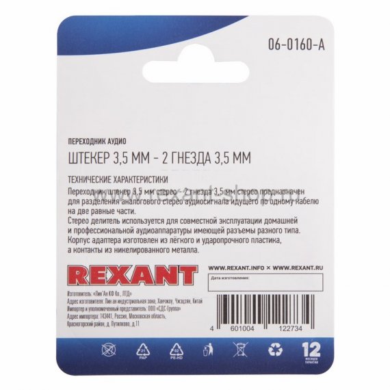 Купить по низким ценам Rexant 06-0160-A Описание Rexant 06-0160-A Переходник штекер 3.5мм стерео - 2 гнезда 3.5мм стерео предназначен для разделения аналогового стерео аудиосигнала идущего по одному кабелю на две равные части. Стерео делитель используется для совместной эксплуатации домашней и профессиональной аудиоаппаратуры имеющей разъемы разного типа. Корпус адаптера изготовлен из лёгкого и ударопрочного пластика, а контакты из никелированного металла.