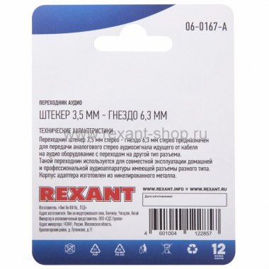 Rexant Переходник аудио (штекер 3,5 мм стерео - гнездо 6,3мм стерео), металл 06-0167-A Rexant 06-0167-A