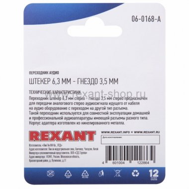 Rexant Переходник аудио (штекер 6,3 мм стерео - гнездо 3,5мм стерео) 06-0168-A
