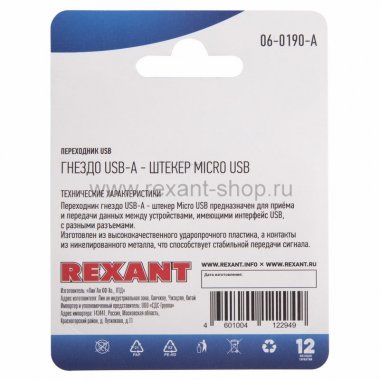 Купить по низким ценам Rexant 06-0190-A Описание Rexant 06-0190-A Переходник гнездо USB-A - штекер Micro USB предназначен для приема и передачи данных между устройствами, имеющими интерфейс USB, с разными разъемами. Он изготовлен из высококачественного ударопрочного пластика, а контакты из никелированного металла, что способствует стабильной передачи сигнала.