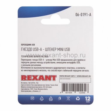 Купить по низким ценам Rexant 06-0191-A Описание Rexant 06-0191-A Переходник гнездо USB-A - штекер Mini USB предназначен для приема и передачи данных между устройствами, имеющими интерфейс USB, с разными разъемами. Он изготовлен из высококачественного ударопрочного пластика, а контакты из никелированного металла, что способствует стабильной передачи сигнала.