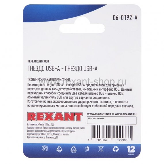 Rexant Переходник USB (гнездо USB-A - гнездо USB-А) 06-0192-A