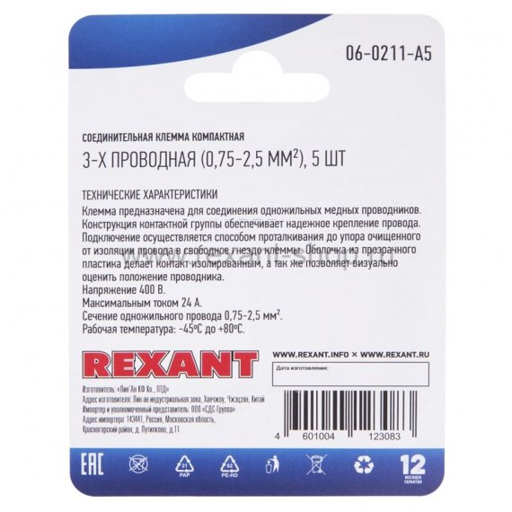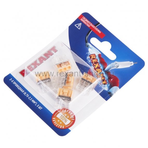 Соединительная клемма компактная, 3-х проводная (0,75-2,5 мм?), (5шт.) REXANT