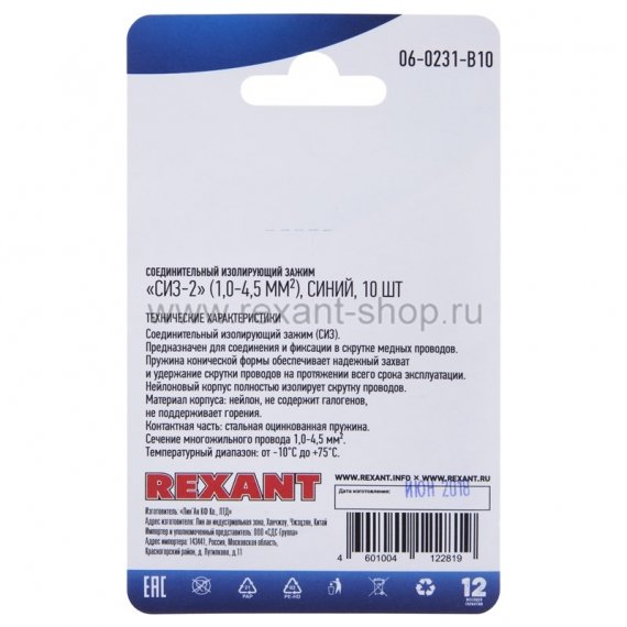Купить по низким ценам Rexant 06-0231-B10 Описание Rexant 06-0231-B10 Соединительный изолирующий зажим, синий. Предназначен для соединения и фиксации в скрутке медных проводов. Контактная часть: стальная оцинкованная пружина. Материал корпуса: нейлон 6.6, не содержит галогенов, не поддерживает горения. Пружина конической формы обеспечивает надежный захват и удержание скрутки проводов на протяжении всего срока эксплуатации. Нейлоновый корпус полностью изолирует скрутку проводов.