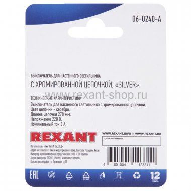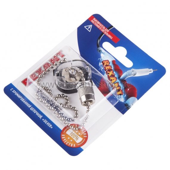 Выключатель для настенного светильника с хромированной цепочкой. Длинна цепочки 270мм. Напряжение 220В. Номинальный ток 3А