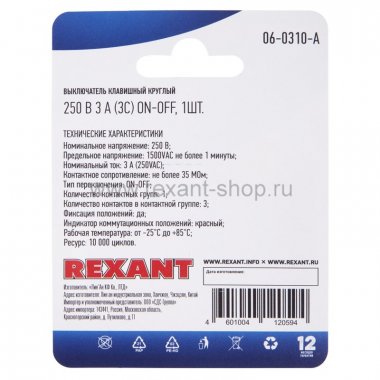 Rexant Выключатель клавишный круглый 250V 3А (3с) 06-0310-A