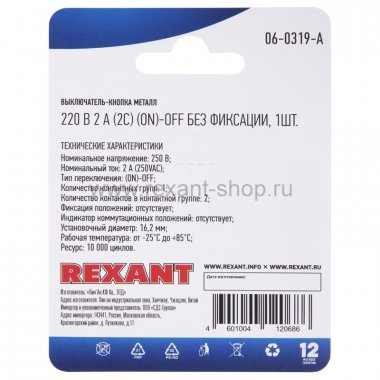 Rexant Выключатель-кнопка металл 220V 2А (2с) 06-0319-A