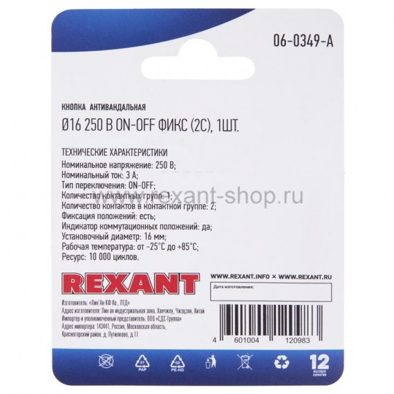 Кнопка антивандальная ?16 Фикс (2с) ON-OFF выпуклая (A16-A3) REXANT (в упак. 1шт.)