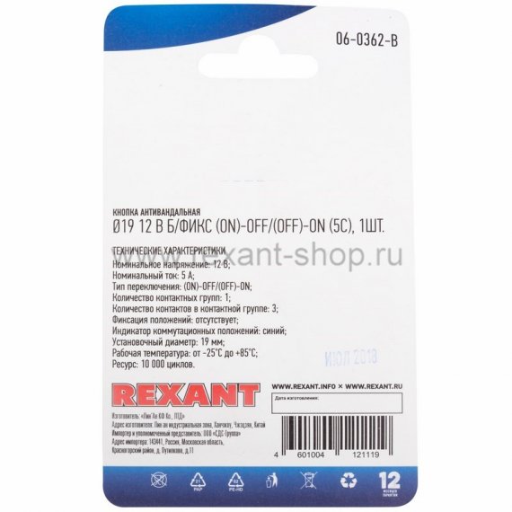 Кнопка антивандальная ?19 12В Б/Фикс (5с) (ON)-OFF/(OFF)-ON синяя (A19-C1) REXANT (в упак. 1шт.)
