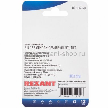 Кнопка антивандальная ?19 12В Фикс (5с) ON-OFF/OFF-ON подсв/белая REXANT (в упак. 1шт.)