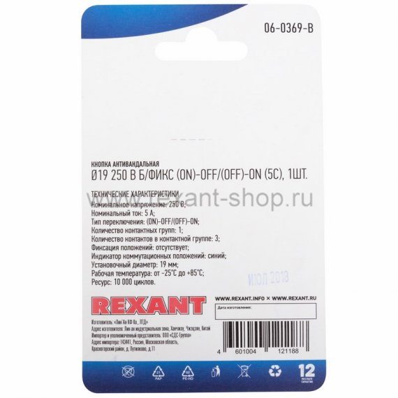 Кнопка антивандальная ?19 250В Б/Фикс (5с) (ON)-OFF/(OFF)-ON синяя (A19-C1) REXANT (в упак. 1шт.)