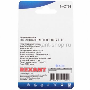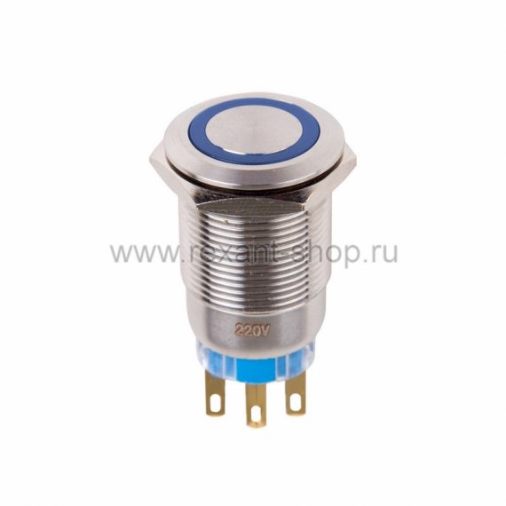 Кнопка антивандальная ?19 250В Фикс (5с) ON-OFF/OFF-ON подсв/синяя REXANT (в упак. 1шт.)