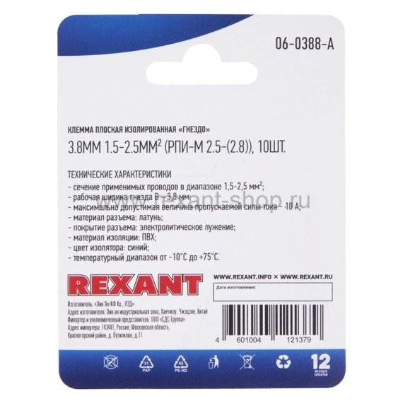 КЛЕММА ПЛОСКАЯ изолированная гнездо - 3.8мм 1.5-2.5мм? (РПи-м 2.5-(2.8) / РПИм 2-250 / FDD2-110(8)) REXANT (в упак. 10шт.)