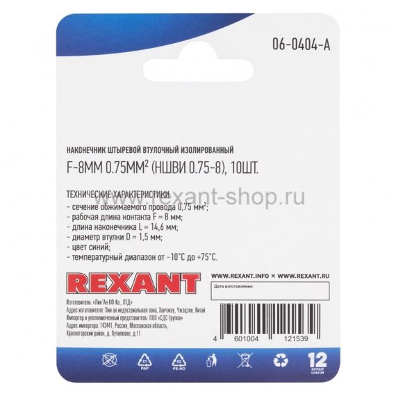 НАКОНЕЧНИК ШТЫРЕВОЙ ВТУЛОЧНЫЙ изолированный F-8мм 0.75мм? (НШВи 0.75-8 / E7508) синий REXANT (в упак. 10шт.)
