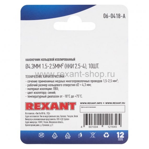 НАКОНЕЧНИК КОЛЬЦЕВОЙ изолированный ?4.3мм 1.5-2.5мм? (НКи 2.5-4 / НКи2-4 / RVS2-4) синий REXANT (в упак. 10шт.)