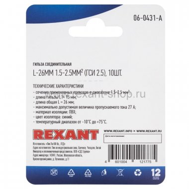 Rexant СОЕДИНИТЕЛЬНАЯ ГИЛЬЗА изолированная L-26мм 06-0431-A Rexant 06-0431-A
