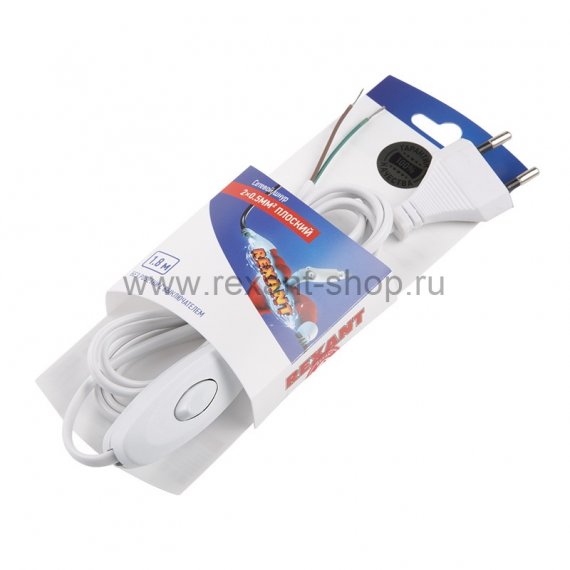 Шнур сетевой 1.8М с выключателем без розетки 2.5A-220V белый REXANT предназначен для подключения к сети переменного тока (AC) с напряжением 220B электроприборов напрямую (скруткой или клеммным соединителем), без использования розетки. Данный шнур состоит из двухжильного провода, с одной стороны литой неразборной плоской вилки (Евро), с другой подготовленных (зачищенных и облуженных оловом) проводников и расположенного посередине провода пластикового выключателя. Основные характеристики: