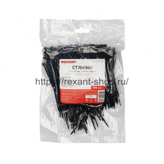 Хомут нейлоновый (кабельная стяжка) 100х2,5 мм чёрный REXANT предназначен для крепления или обвязки в жгут кабелей и проводов, крепления гибких гофротруб, а также других предметов к несущей поверхности или для соединения между собой.