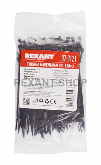 Представленный нейлоновый хомут 2.5 на 120мм, иначе называемый кабельная стяжка, имеет черный цвет. Что обусловлено применяемыми в нём модификаторами и наполнителями. Которые, в свою очередь, обеспечивают такие его свойства как: