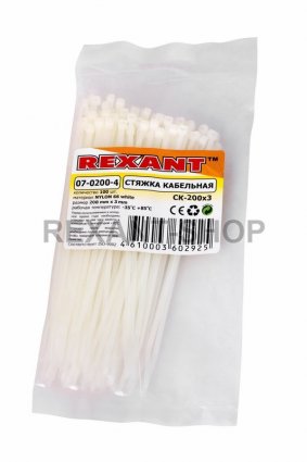Хомуты 3 на 200 мм белые REXANT имеют длину – 200 мм и ширину – 3,0 мм для обеспечения необходимого объёма и прочности соединяемого пучка.