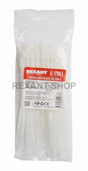 Хомут 200х5 мм белый REXANT имеет длину – 200 мм и ширину – 5 мм для обеспечения необходимого объёма и прочности соединяемого пучка.