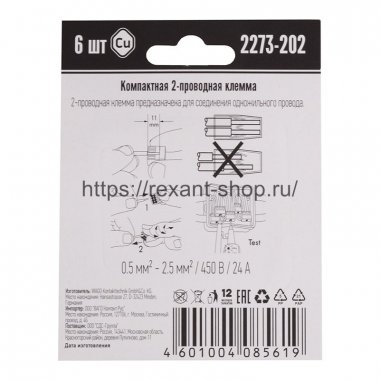 Купить по низким ценам Rexant 07-5131-06 Описание Rexant 07-5131-06 Электромонтажные экспресс-клемы WAGO 2273-202 позволят безопасно и быстро соединить 2 провода между собой (алюминиевые и медные как одножильные, так и многожильные). Достаточно просто вставить жилу кабеля или провода в клемму и самозажимной контакт надежно зафиксирует соединение. Диаметр соединяемых проводов должен составлять в сечении от 0,5 до 2,5 мм2. Номинальный ток 24А; Номинальное напряжение 450В. Удобные тестовые гнезда, прозрачный корпус для визуального контроля и смотровое окно для проверки защиты от касаний делают работу более безопасной.
