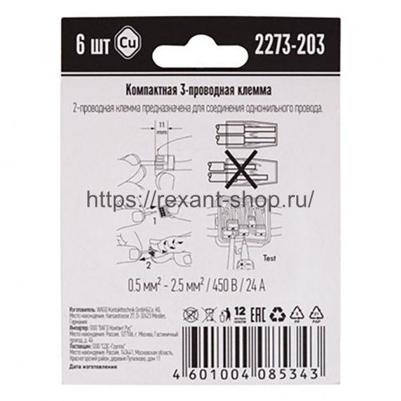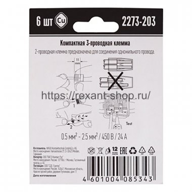 Купить по низким ценам Rexant 07-5132-06 Описание Rexant 07-5132-06 Электромонтажные экспресс-клемы WAGO 2273-203 позволят безопасно и быстро соединить 3 провода между собой (алюминиевые и медные как одножильные, так и многожильные). Достаточно просто вставить жилу кабеля или провода в клемму и самозажимной контакт надежно зафиксирует соединение. Диаметр соединяемых проводов должен составлять в сечении от 0,5 до 2,5 мм2. Номинальный ток 24А; Номинальное напряжение 450В. Удобные тестовые гнезда, прозрачный корпус для визуального контроля и смотровое окно для проверки защиты от касаний делают работу более безопасной.