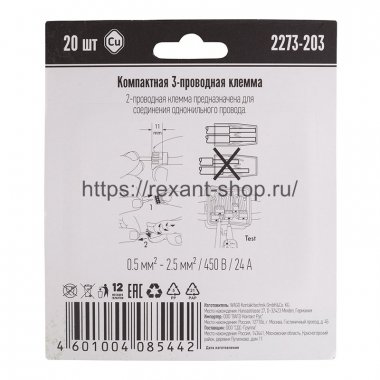 Купить по низким ценам Rexant 07-5132-20 Описание Rexant 07-5132-20 Электромонтажные экспресс-клемы WAGO 2273-203 позволят безопасно и быстро соединить 3 провода между собой (алюминиевые и медные как одножильные, так и многожильные). Достаточно просто вставить жилу кабеля или провода в клемму и самозажимной контакт надежно зафиксирует соединение. Диаметр соединяемых проводов должен составлять в сечении от 0,5 до 2,5 мм2. Номинальный ток 24А; Номинальное напряжение 450В. Удобные тестовые гнезда, прозрачный корпус для визуального контроля и смотровое окно для проверки защиты от касаний делают работу более безопасной.