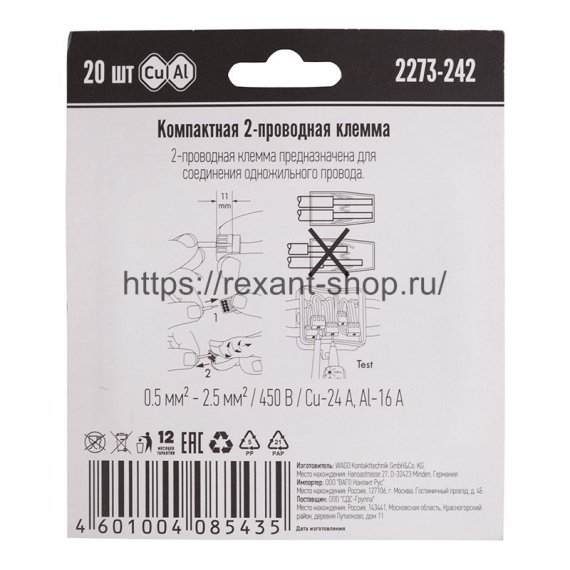 Купить по низким ценам Rexant 07-5141-20 Описание Rexant 07-5141-20 Элетромонтажные экспресс-клемы WAGO 2273-242 позволят безопасно и быстро соединить 2 провода между собой (алюминиевые и медные как одножильные, так и многожильные). Достаточно просто вставить жилу кабеля или провода в клемму и самозажимной контакт надежно зафиксирует соединение. Диаметр соединяемых проводов должен составлять в сечении от 0,5 до 2,5 мм2. Номинальный ток 24А; Номинальное напряжение 450В. Удобные тестовые гнезда, прозрачный корпус для визуального контроля и смотровое окно для проверки защиты от касаний делают работу более безопасной. Наличие пасты обеспечивает надёжную изоляцию контакта