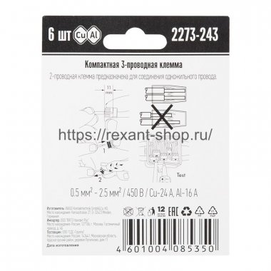 Купить по низким ценам Rexant 07-5142-06 Описание Rexant 07-5142-06 Электромонтажные экспресс-клемы WAGO 2273-243 позволят безопасно и быстро соединить 3 провода между собой (алюминиевые и медные как одножильные, так и многожильные). Достаточно просто вставить жилу кабеля или провода в клемму и самозажимной контакт надежно зафиксирует соединение. Диаметр соединяемых проводов должен составлять в сечении от 0,5 до 2,5 мм2. Номинальный ток 24А; Номинальное напряжение 450В. Удобные тестовые гнезда, прозрачный корпус для визуального контроля и смотровое окно для проверки защиты от касаний делают работу более безопасной. Наличие пасты обеспечивает надёжную изоляцию контакта