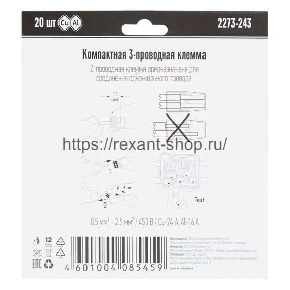 Купить по низким ценам Rexant 07-5142-20 Описание Rexant 07-5142-20 Электромонтажные экспресс-клемы WAGO 2273-243 позволят безопасно и быстро соединить 3 провода между собой (алюминиевые и медные как одножильные, так и многожильные). Достаточно просто вставить жилу кабеля или провода в клемму и самозажимной контакт надежно зафиксирует соединение. Диаметр соединяемых проводов должен составлять в сечении от 0,5 до 2,5 мм2. Номинальный ток 24А; Номинальное напряжение 450В. Удобные тестовые гнезда, прозрачный корпус для визуального контроля и смотровое окно для проверки защиты от касаний делают работу более безопасной. Наличие пасты обеспечивает надёжную изоляцию контакта